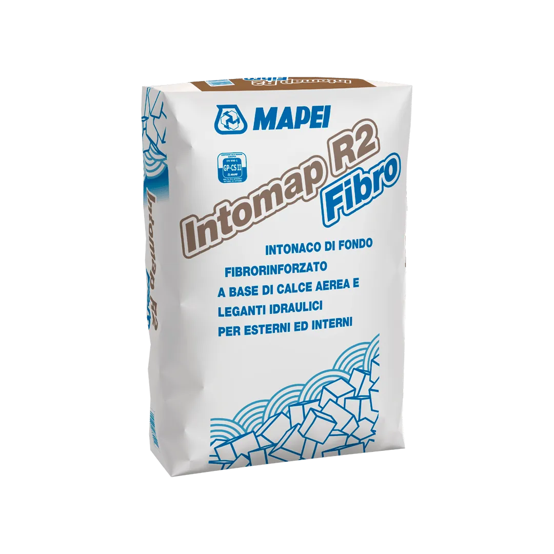 Intomap R2 Fibro è una malta premiscelata fibrorinforzata monocomponente di colore grigio chiaro a base di calce aerea, leganti idraulici, fibre in polipropilene, sabbie calcaree selezionate e speciali additivi in polvere, secondo una formula sviluppata nei laboratori di ricerca MAPEI. Grazie alla sua particolare composizione, l’intonaco ottenuto miscelando Intomap R2 Fibro con acqua possiede una buona adesione e può essere applicato a mano o con macchina intonacatrice su quasi tutti i supporti. Inoltre, la presenza delle fibre conferisce alla malta una maggiore resistenza a trazione in fase plastica, riducendo così notevolmente le possibilità di microfessurazioni durante la prima fase di indurimento. Nel caso di suppporti realizzati in calcestruzzo o in laterizio di vecchia fattura o in muratura mista, si consiglia di trattare le superfici con una prima mano di Intomap R2 Fibro miscelato con Planicrete diluito 1:2 con acqua, al fine di creare un “ponte di aggancio” e di uniformare gli assorbimenti. Intomap R2 Fibro è classificato secondo la normativa europea EN 998-1 come GP “Malta per scopi generali per intonaci interni/esterni” di categoria CS II.
