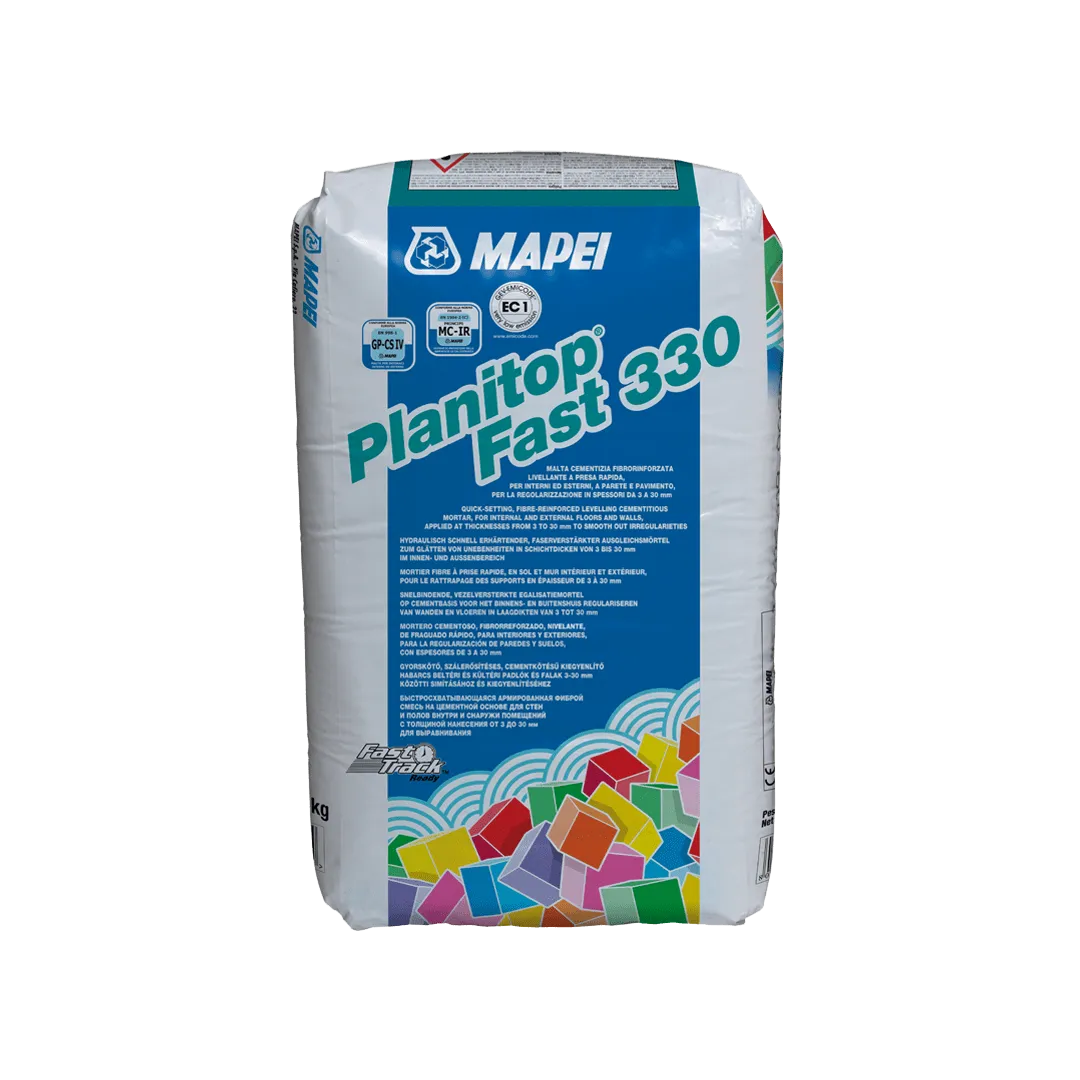 Regolarizzazione di supporti non planari, all’interno e all’esterno per renderli idonei, in breve tempo, alla posa di ceramica e materiale lapideo o all’impermeabilizzazione con membrane liquide o sistemi cementizi elastici. Spessore di applicazione da 3 a 30 mm. Alcuni esempi di applicazione · Regolarizzazione delle superfici in calcestruzzo armato di piscine per renderle idonee (dopo solo 24 ore alla temperatura di +20°C) all’impermeabilizzazione con Mapelastic, Mapelastic Smart, Monolastic, Monolastic Ultra, o dopo solo 4 ore a +20°C, alla posa diretta di ceramica e mosaico di ogni tipo. · Rasatura all’interno e all’esterno di tutti i normali supporti presenti in edilizia purchè puliti, quali solette in calcestruzzo, massetti cementizi o a base di leganti speciali (tipo Topcem, Topcem Pronto, Mapecem, Mapecem Pronto), vecchi pavimenti in ceramica, marmette, materiale lapideo, per procedere in breve tempo (dopo solo 4 ore a +20°C) alla posa di ceramica e materiale lapideo non sensibile all’umidità o all’impermeabilizzazione con Mapelastic, Mapelastic Smart, Monolastic, Monolastic Ultra, Mapegum WPS (dopo solo 24 ore a +20°C). · Ripristino e realizzazione delle pendenze in terrazze e balconi. CARATTERISTICHE TECNICHE Planitop Fast 330 è una malta cementizia monocomponente di colore grigio, a bassissima emissione di sostanze organiche volatili (EMICODE EC1), costituita da speciali leganti cementizi, aggregati selezionati, resine sintetiche e additivi speciali, secondo una formulazione sviluppata nei Laboratori di Ricerca MAPEI. Impastato con acqua, si trasforma in un impasto facilmente lavorabile, applicabile anche in verticale a cazzuola o a spatola e caratterizzato da un’elevata adesione su tutti i normali supporti presenti in edilizia. Planitop Fast 330 indurisce velocemente, anche a elevati spessori, senza subire ritiri e senza formare crepe o fessurazioni, fino a raggiungere apprezzabili resistenze meccaniche, tali da permettere la successiva posa di rivestimenti ceramici, in mosaico vetroso o in materiale lapideo. Planitop Fast 330 risponde ai principi definiti nella EN 1504-9 (“Prodotti e sistemi per la protezione e la riparazione delle strutture in calcestruzzo: definizioni, requisiti, controllo di qualità e valutazione della conformità. Principi generali per l’uso dei prodotti e sistemi”) e ai requisiti richiesti dalla EN 1504-2 rivestimento (C) secondo i principi MC e IR (“Sistemi di protezione della superficie di calcestruzzo”) ed è classificata come GP (“Malta per scopi generali per intonaci interni/esterni”), di categoria CS IV, secondo EN 998-1.